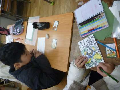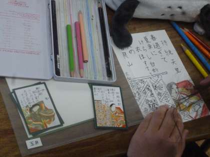 4年生は国語で百人一首を学習しましたが、それに関連して絵札を作っていきました。実際の絵札をよく見てていねいに仕上げていきました。