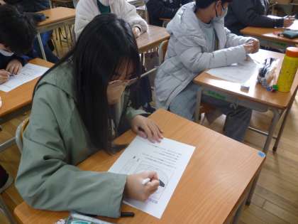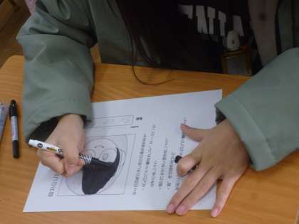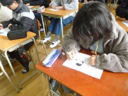 6年生は自分の似顔絵を描きました。黒のサインペンでていねいに仕上げていました。この似顔絵は最終の学校新聞に載せるためです。