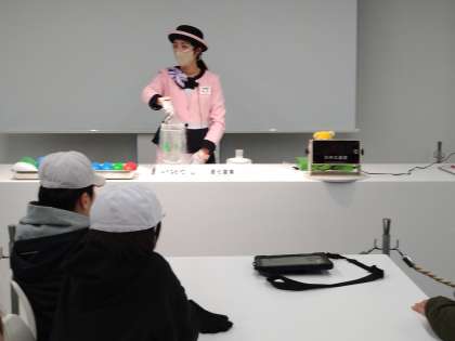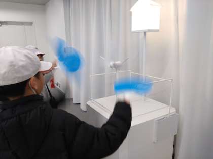 実験ブースに移動しました。液化窒素の演示実験を見て、その性質を理解しました。うちわであおぐ風力発電や太陽パネルの実験にも参加でき、楽しい時間を過ごしました。