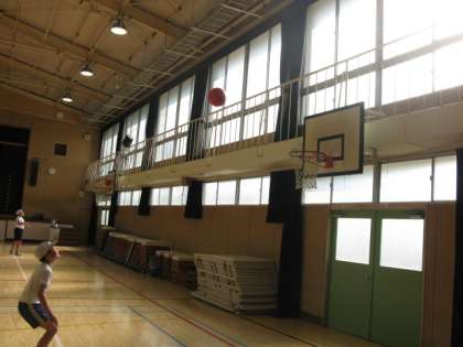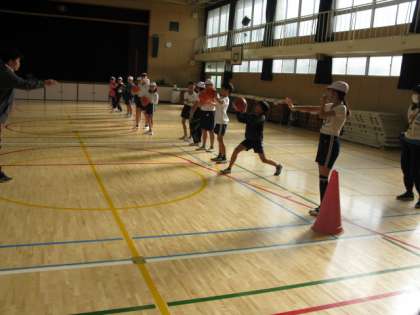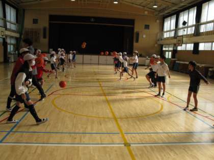 5年生は体育でバスケットボールを始めました。今日はパスなど基本的な練習を進めました。。