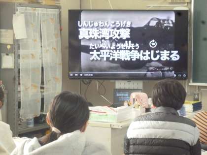 6年生は歴史の学習が太平洋戦争の時代になりました。今日は真珠湾攻撃の当時の映像を見て、学習を進めていきました。平和について考えていく重要な学習です。