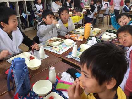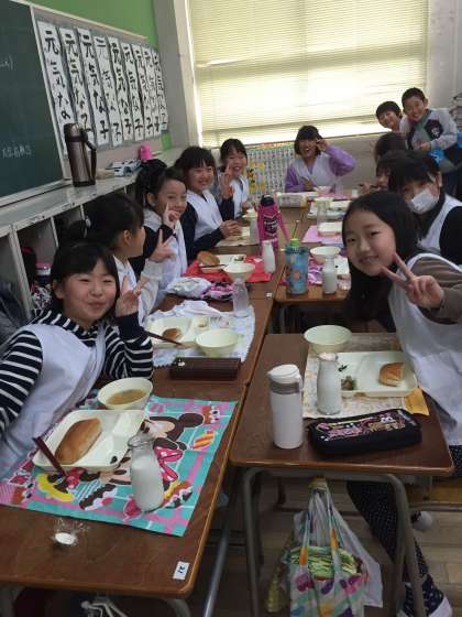 今日から給食が始まりました。久しぶりに友達といっしょの食事です。4年生の教室では男子と女子で食べていました。人数が少ないけれど、女の子たちは「女子会」を楽しんでいました。