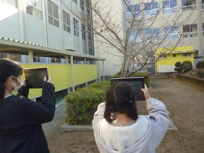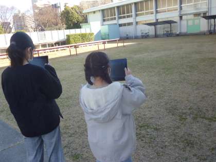 4年生は理科で冬の観察をしました。タブレットで冬の様子を写真に撮っていきました。さすがに虫はいないので、桜の木の芽や茶色くなった芝生などを撮っていました。
