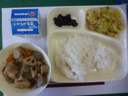 1月17日の給食は「筑前煮」「ツナとキャベツのごまいため」「黒豆の煮物」です。筑前煮は多くの具があり、食べ応え満点でした。