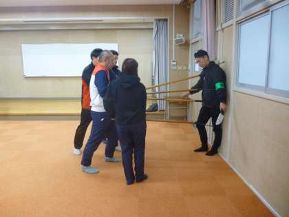 放課後には、警官から教職員への防犯研修がありました。さすまたの使い方や留意点を教えてもらい、実技を習いました。