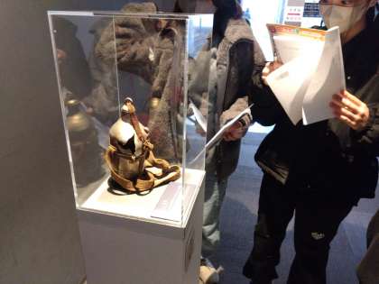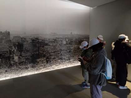 銃の玉が当たって破損した水筒を見て、戦争の悲惨さを感じていました。大阪大空襲の後の大阪の町の空撮を見て、さらにその気持ちを高めました。