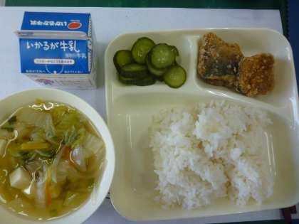 1月24日の給食は「さばのカレー竜田揚げ」「五目汁」「きゅうりの甘酢和え」です。竜田揚げはカレー味とさばがよく合っていて、サクッとした歯触りでとてもよい味でした。