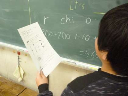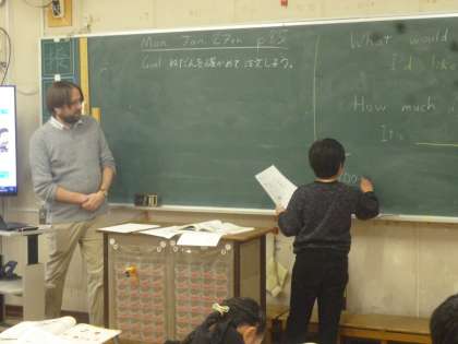 5年生は英語の学習で、英語で買い物をする活動をしました。教科書の挿し絵(値段が書かれた絵)から800円で買える買い物をして、発表していきました。
