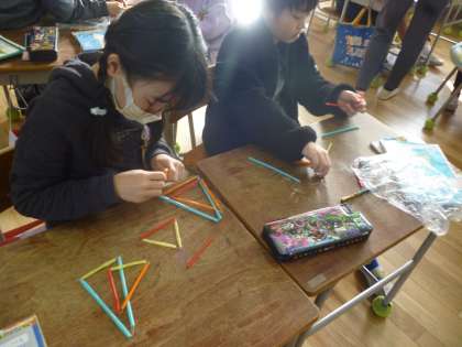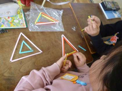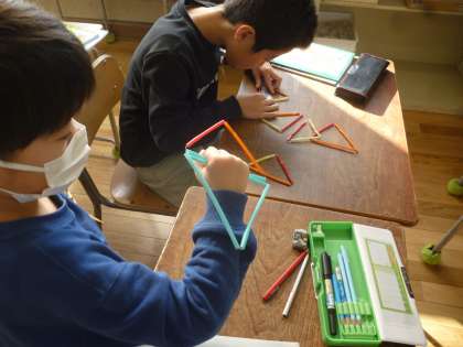 3年生は算数で三角形について学習しています。写真のようにストローで作った三角形を辺の長さに着目して、3つに分類していきました。