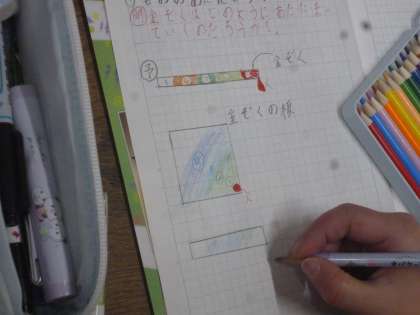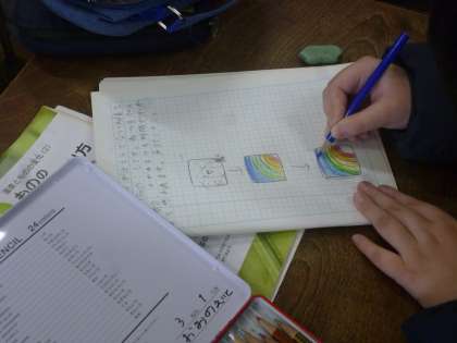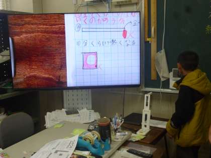 4年生は理科の学習で銅板や鉄の棒のあたたまり方の予想を立てました。銅板や鉄の棒を端から温めると、どのように熱が広がっていくかを考えて発表していきました。ノートに図を書き、熱の伝わり方を色を塗って予想していきました。これから実験でその予想を確かめていきます。