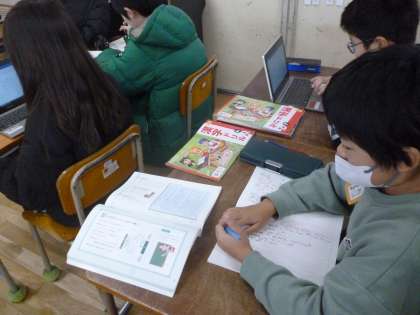 4年生は国語で商店街の2種類のちらしを1つ選び、それについての考えをまとめていきました。パっと見て選ぶのではなく、色、デザイン、文章表記、レイアウトなど、多岐にわたってその良さを考えてまとめていきました。なかなかむずかしい学習ですが、子どもたちは一生懸命に考えていました。