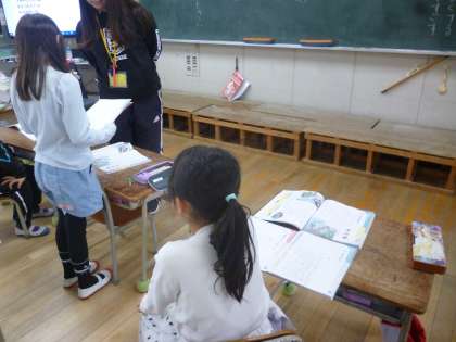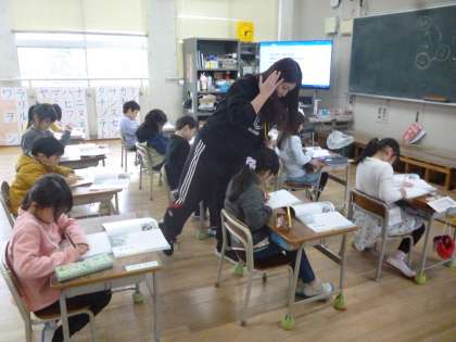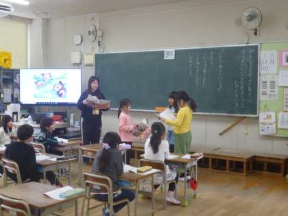1年生は道徳で「ふたりだけで」というお話を学習しました。ラッコの友達が二人で楽しく遊んでいました。そこに別の友達が来て、その遊びに入れてと頼みました。一人の友達は二人だけで遊びたいので、断りましたが、もう一人の友達が一緒に遊ぶことを言いました。この話から、自分がその三人のそばにいたらなんというのかを考えていきました。ラッコ達の気持ちを考えるために、前で劇化をしました。みんなよく考えて発表していきました。