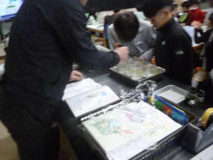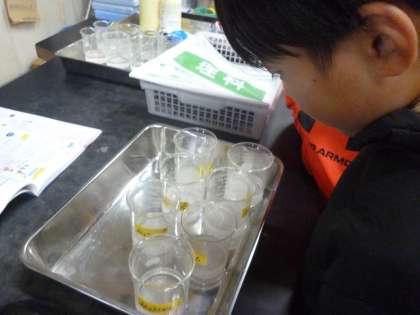 5年生は理科の実験でお湯に溶かしたミョウバンがどうなったかを観察しました。しっかりと大きな結晶になっており、目で確かめていきました。