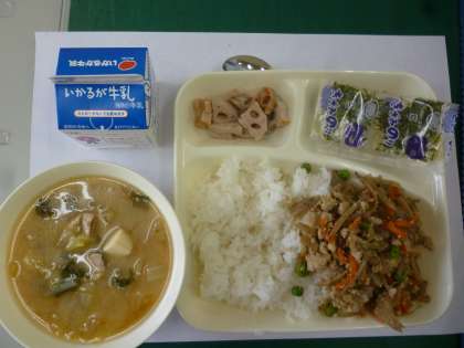 2月最初の給食は「鶏ごぼうごはん」「みそ汁」「焼きれんこん」です。鶏ごぼうご飯はきざみのりをかけて食べます。鶏ごぼうご飯は具と御飯がとても合っていて食が進みました。