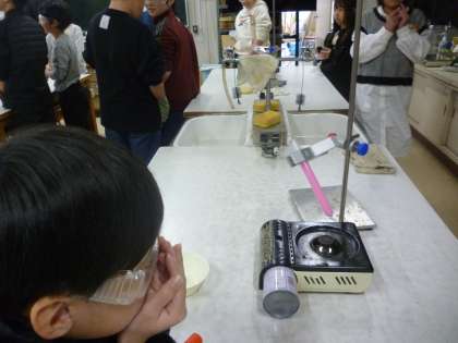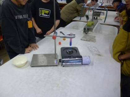 4年生は理科の実験で水は上中下のどこからあたたまるかを確かめました。試験管に青色の詩音インクを入れ、下部に火を当てました。あたたまるとピンク色に変わります。