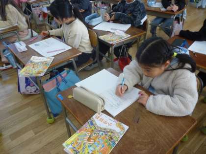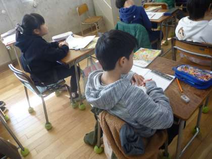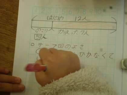 2年生は算数で初めてテープ図を使いました。問題は「はじめに12人いました。7人がかえりました。残りは何人ですか」です。ノートにテープ図を書いて説いていきました。テープ図にすると引き算で解くことがよくわかります。