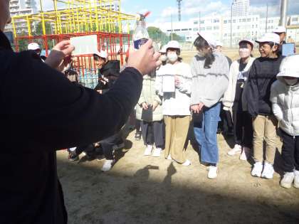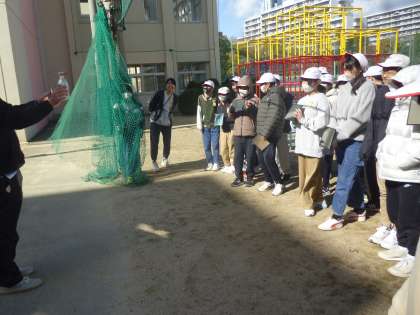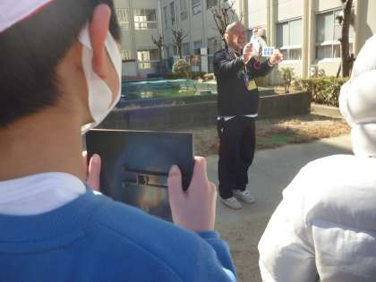6年生は理科で発電の学習をしています。前の時間は手回し発電でした。次は太陽光発電の実験をしました。鏡で太陽光パネルに光を当て、接続したモーターでプロペラを回しました。大変だったのは担当の先生です。太陽光パネルを鏡に向けていましたが、みんなの鏡の反射光がとてもまぶしく、顔の向きを変えるのに苦労していました。