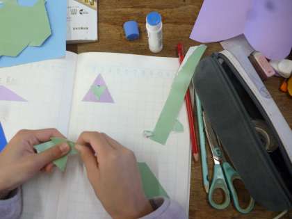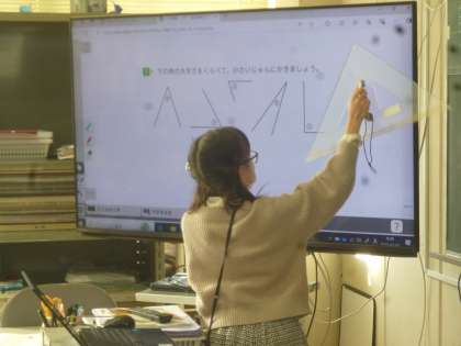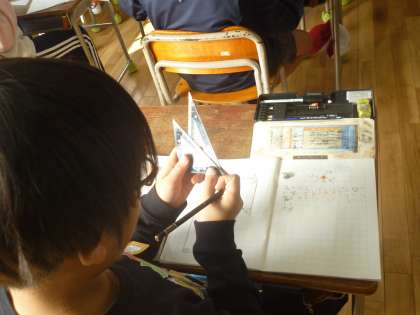 3年生は算数で三角形の性質を考えてきて、その学習を終えました。三角定規やコンパス、色紙で三角形を作るなど、作業を通して学習を展開して理解していきました。