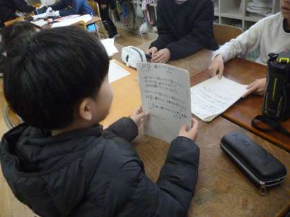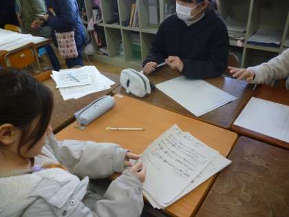 4年生は国語で、アンケートをもとにみんなの考えをまとめる学習をしています。各班でアンケートのテーマを決め、みんなにそのアンケートに答えてもらい、まとめていきます。みんなから集めたアンケートを整理しながらみんなの考えをまとめていました。