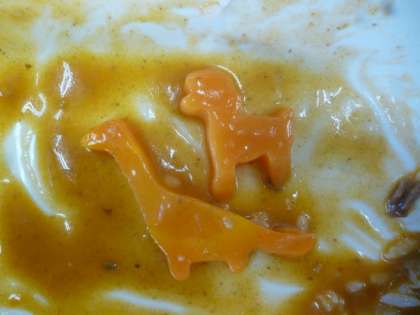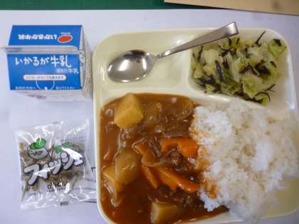 2月10日の給食は「ハヤシライス」「キャベツのひじきドレッシング」「ミニフィッシュ」です。ハヤシライスはまろやかな味付けで、ラッキー人参が2つも入っていました。