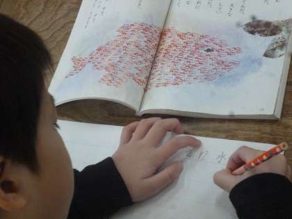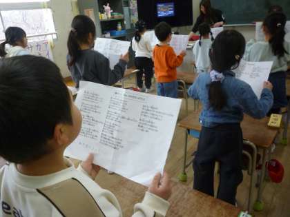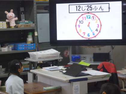 1年生は国語で「スイミー」を学習しています。小さな魚が集まって大きな魚の形になって、自分たちの命を守るという有名な物語です。算数では「何時何分」など、時計が読めるようになりました。「卒業を祝う会」に向けて歌の練習にも余念がありません。