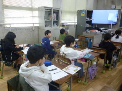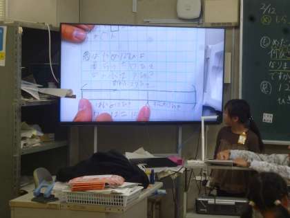 2年生は算数の学習で「めだかを15匹飼っています。何匹かもらったので27匹になりました。もらったのは何匹ですか」という問題を考えました。この問題はなかなか難しく、考え違いをしている子も多くいました。テープ図を書いて問題を整理して、正しい式を書いていました。