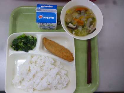 2月13日(木)の給食は、「たらフライ」「うすくず汁」「こまつなのごまあえ」でした。「たらフライ」は約170度の油で衣がサクサクに揚げられていました。「うすくず汁」には葛(くず)のかわりにじゃがいもでんぷんが入っていて、ほど良いとろみがついていて、舌触りもよく美味しくいただきました。。また、とろみのおかげで汁が冷めにくくなっていました。「こまつなのごまあえ」はシャキシャキの食感とごまダレの甘さがマッチしていました。
