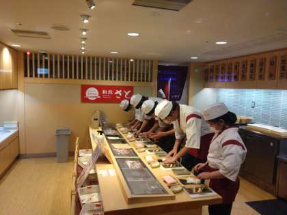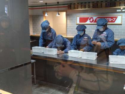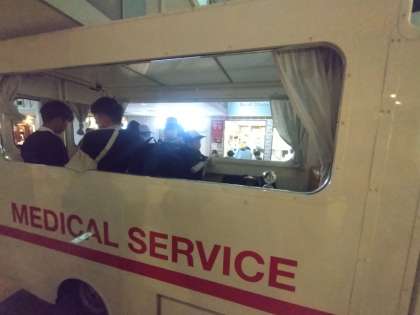 病院は救急車に乗り、フロアを廻ります。お寿司作り、パスタ作りと食べ物ブースは人気です。