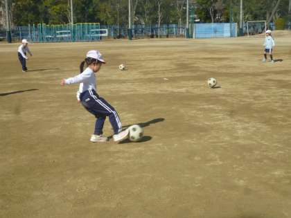 1年生は体育でサッカーを始めました。二人組になり、正確にパスをする練習を繰り返しました。ボールをける表情はとてもうれしそうです。