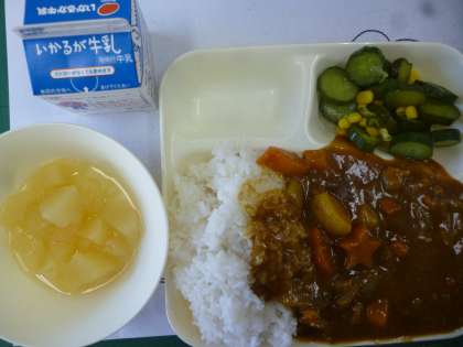 2月18日の給食は「チキンレバーカレーライス」「きゅうりとコーンのサラダ」でデザートに缶詰の洋なしが出ました。チキンとカレールーがよくあっておいしくいただきました。