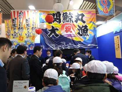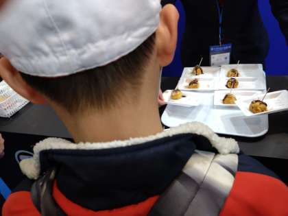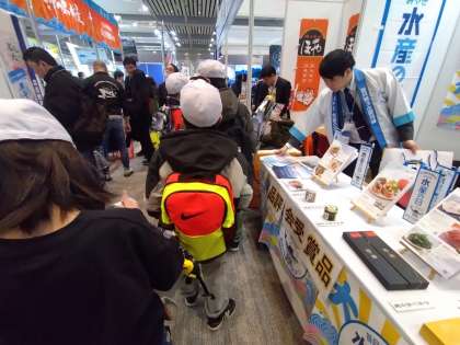 ブースをまわり、見学ながらていきます。写真のたこ焼きは蛸の代わりに鯨肉が入っています。おいしかったです。