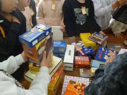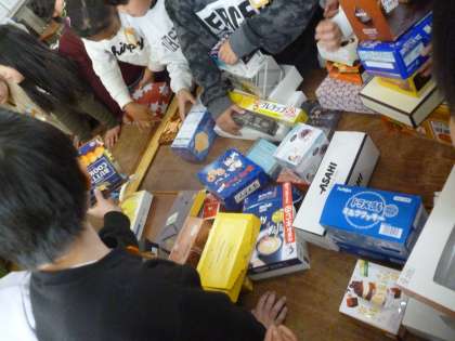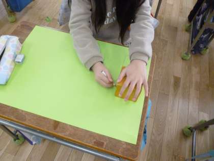 2年生は算数で箱について調べています。今日は箱を紙に写し取り、「面」という用語を習いました。これからその面について詳しく調べていきます。