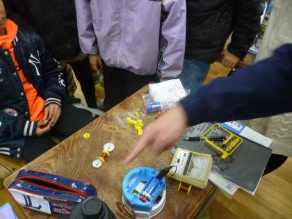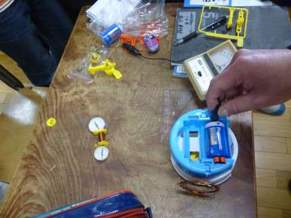 5年生は理科で電気の流れについて調べています。今日は電流計をつなぎ、電池の向きを入れ替えると、電流の向きがどう変わるかを調べました。