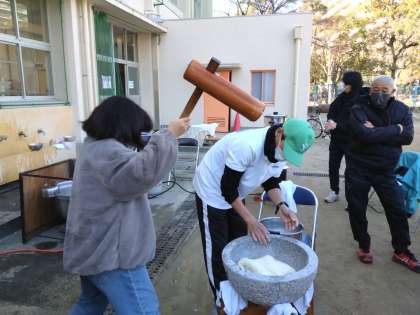 2月23日、太陽地域主催の「こども餅つき大会」が行なわれました。早朝より地域の方々がもち米の炊飯やあんこやいちごの具の用意をいてくださいました。多数の子どもたちが南港光小学校の運動場に集まりました。杵を持っての餅つき体験をして、お腹いっぱいのお餅を食べてみんな満足していました。担当していただいた地域やPTAの皆さん、ありがとうございました。ふ