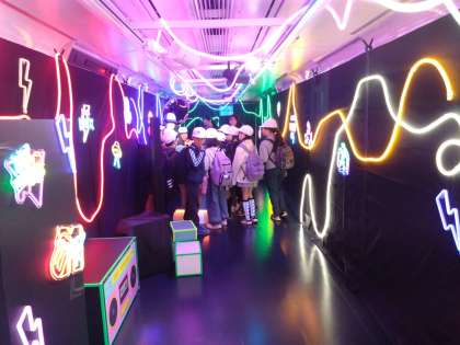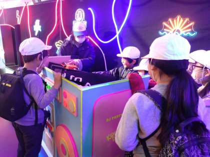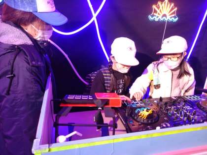 こちらは音楽のDJブースです。音響装置を触って、音楽の音を変えていきました。