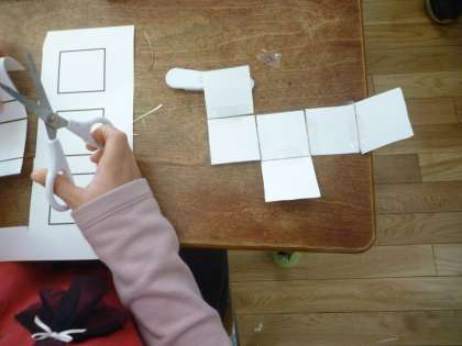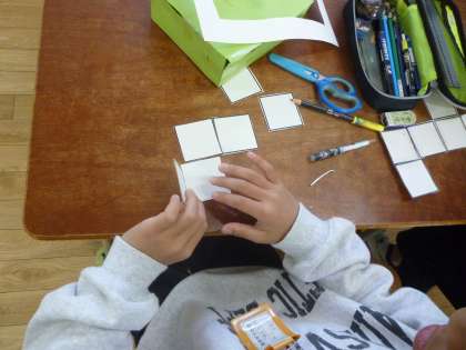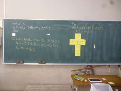 2年生は算数でさいころの形を作りました。画用紙に展開図を書いてはさみで切って組み立てました。展開図は11通りあります。1つできたら、新しい画用紙をもらって次の展開図を考えました。