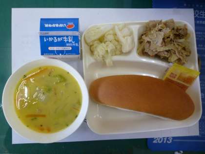 2月27日の給食は「豚肉のカレー風味焼き」「コーンスープ」「カリフラワーのピクルス」です。風味焼きはカレー味と肉がとてもよく合っていました。