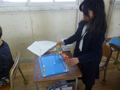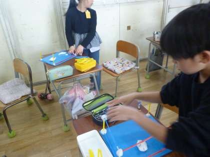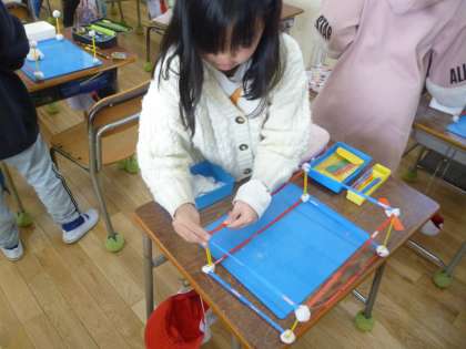 2年生は算数で箱の形を学習しています。棒と粘土を使って箱の形を作っていきます。棒が辺、粘土が頂点になります。辺の数と点の数を確かめていきました。目と手で確認してよく理解することができました。