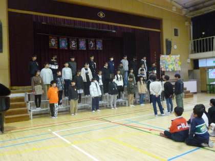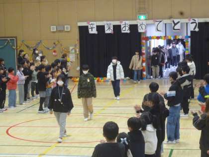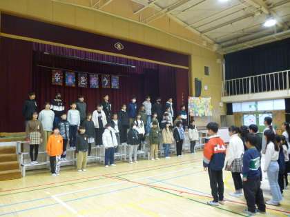 今日はみんなが講堂に集まって「卒業を祝う会」を行いました。まず、6年生が入場し、児童会の「はじめの言葉」で始まりました。