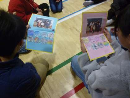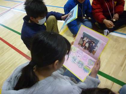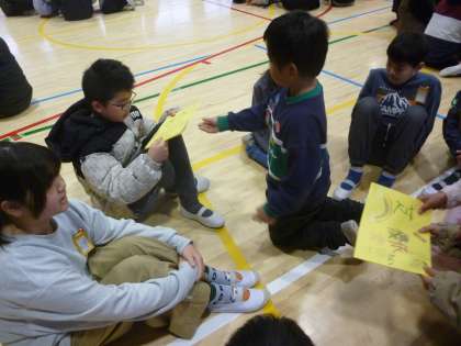 次は在校生が6年生にメッセージカードを渡します。たて割りグループの集合写真とメンバーからの6年生へのメッセージが貼ってあります。6年生は気持ちのこもったメンバーのメッセージを読んで、うれしさをかみしめていました。とてもいい顔で読んでいました。