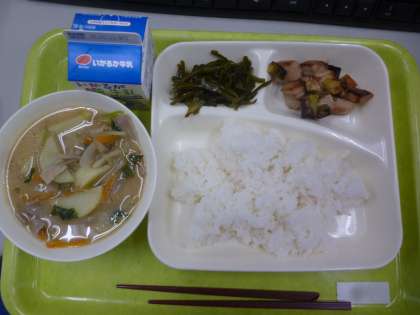 3月5日の給食は「まぐろの甘辛焼き」「豚汁」「茎わかめのつくだ煮」です。今日の茎わかめは、わかめの葉の真ん中の部分で、歯ごたえのある食感が特徴だそうです。カルシウムや食物繊維が多く含んでいて、健康にとてもよい食材です。