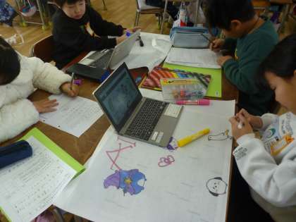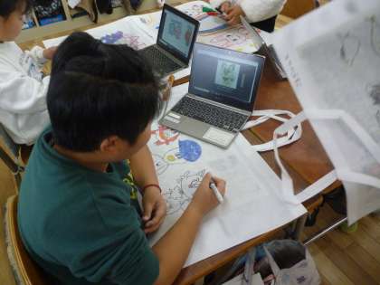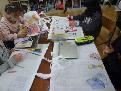 3月に入り、この1年間で作った作品を持ち帰る日が近づいてきました。作品袋に油性ペンなどできれいに絵や文字をかいていきました。