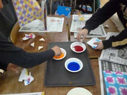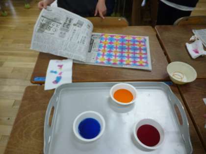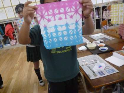 2年生はおり染めをしました。和紙を小さくたたみ、角に染料をつけていきます。和紙を広げるときれいな模様ができました。乾かして本作りの表紙にしていく予定です。