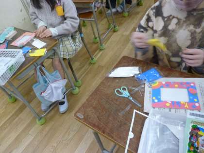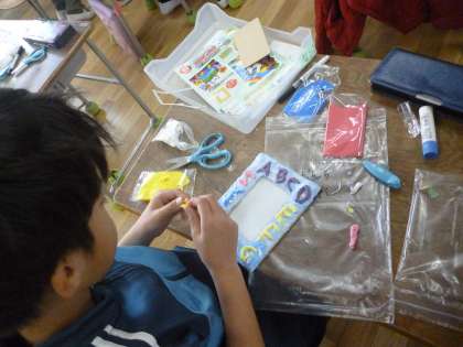 2年生は図工でフォトフレームを作りました。枠にカラーねんどで飾りをつけていきました。どの作品もきれいに装飾されており、出来上がってお気に入りの写真が入るのが楽しみです。