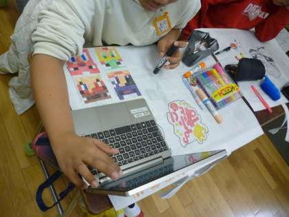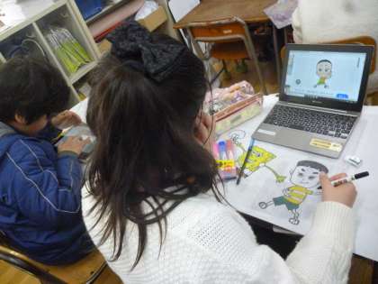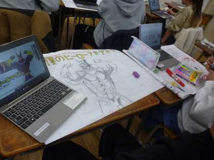 5年生は作品袋を仕上げました。どの学年も仕上げていきますが、インターネットで調べて楽しく描いていました。