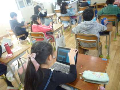 2年生はプログラミング学習に取り組みました。テーマは「キャラクターをゴールにたどり着けるように命令を出す」です。みんな一生懸命に考えてプログラムを組んでいました。