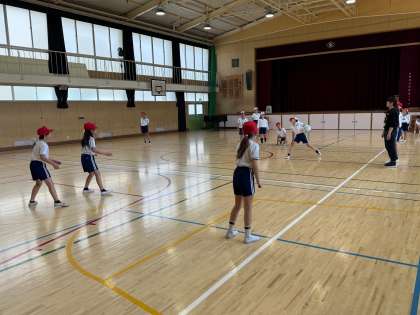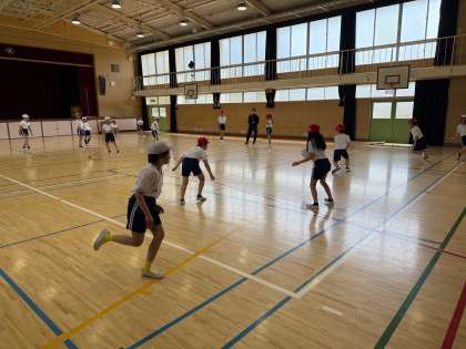 ドッジボールです。みんなボールをかわすのが上手です。
