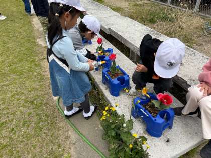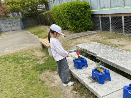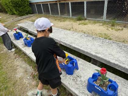 大切に育ててきたチューリップに水やりです。きれいにさいています。