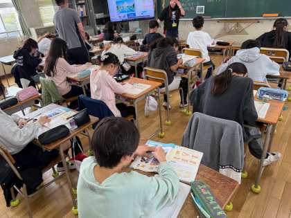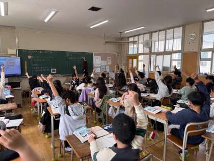 ぴったりと重なる図形について調べています。「右と左が同じ形になっている」「180度回転させると重なる」など、いろいろな意見が出ました。