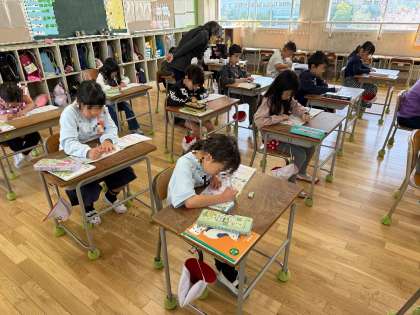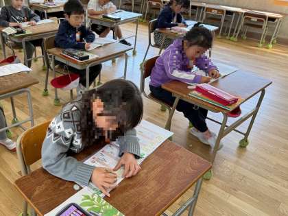 かん字のれんしゅうです。そらがきした後、ドリルに書いていきます。ひつじゅん、かく数をおぼえながら書いています。